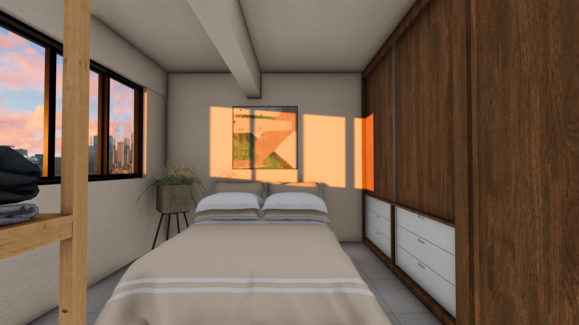 A premissa era um projeto de pequenos apartamentos, com 30m², com vagas de garagem e área de serviço comum para o prédio, ganhando área dentro dos apartamentos.